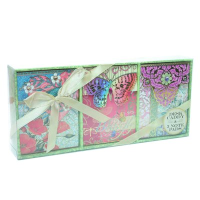 I LOVE these! You get 3 little note pads inside a desk caddy. The notebooks are super cute with lovely floral patterns, bright colors, and gold embossing. They have little rhinestones for a finishing touch. They all have a magnetic closure which I find classy. Even the inside of the note pads is decorated, and the pages themselves mirror the motif on the outside. Then, the caddy itself is decorated with the beautiful paper inside and even on the backside! It reminds me of William Morris wallpaper designs. I use the caddys for office and craft supplies. Whoever designed these should be pleased- I certainly am! I now own 9 sets!